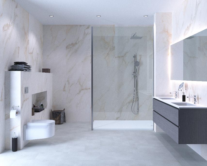 Herstellerfoto Walk-In Dusche mit grauen Betonoptik-Wandverkleidungen und Regenduschkopf